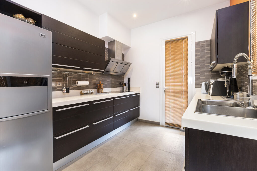 The kitchen is fully equipped with high quality appliances: a dishwasher, oven, a microwave , fridge and washing machine.