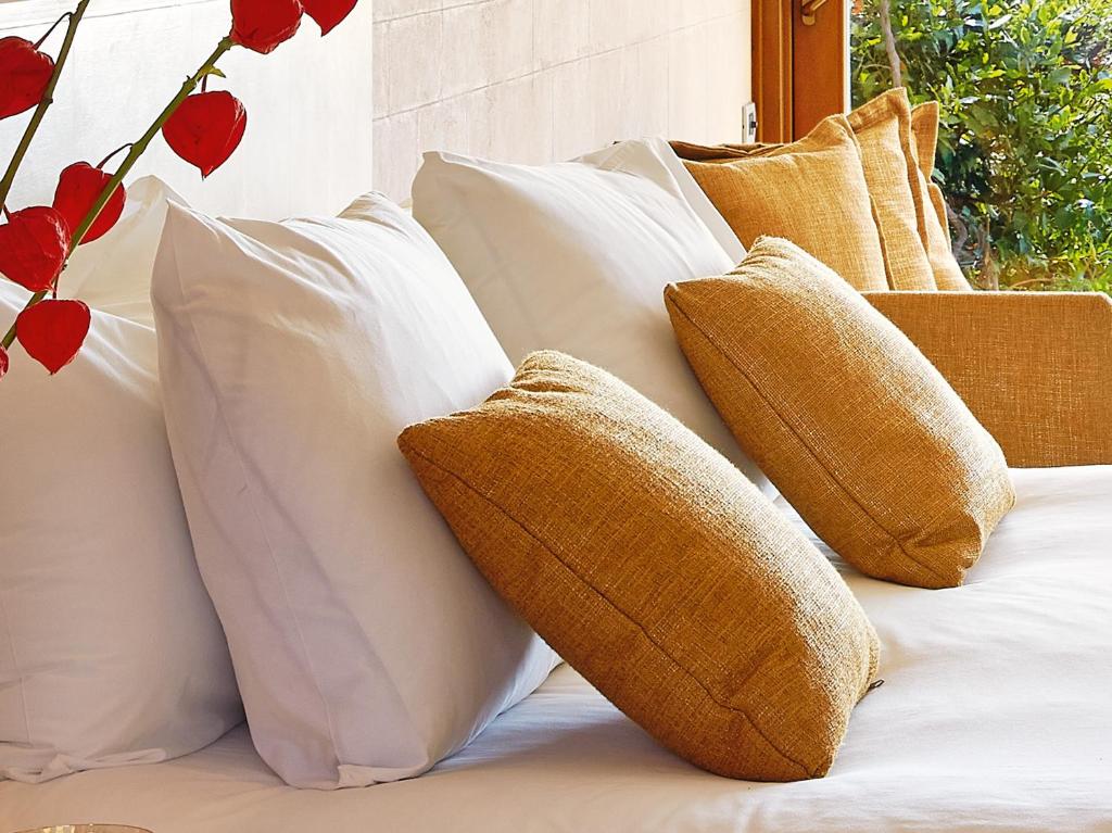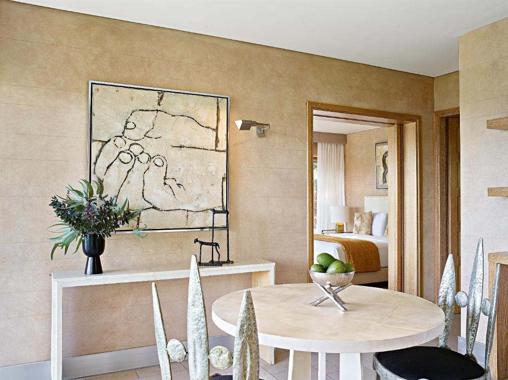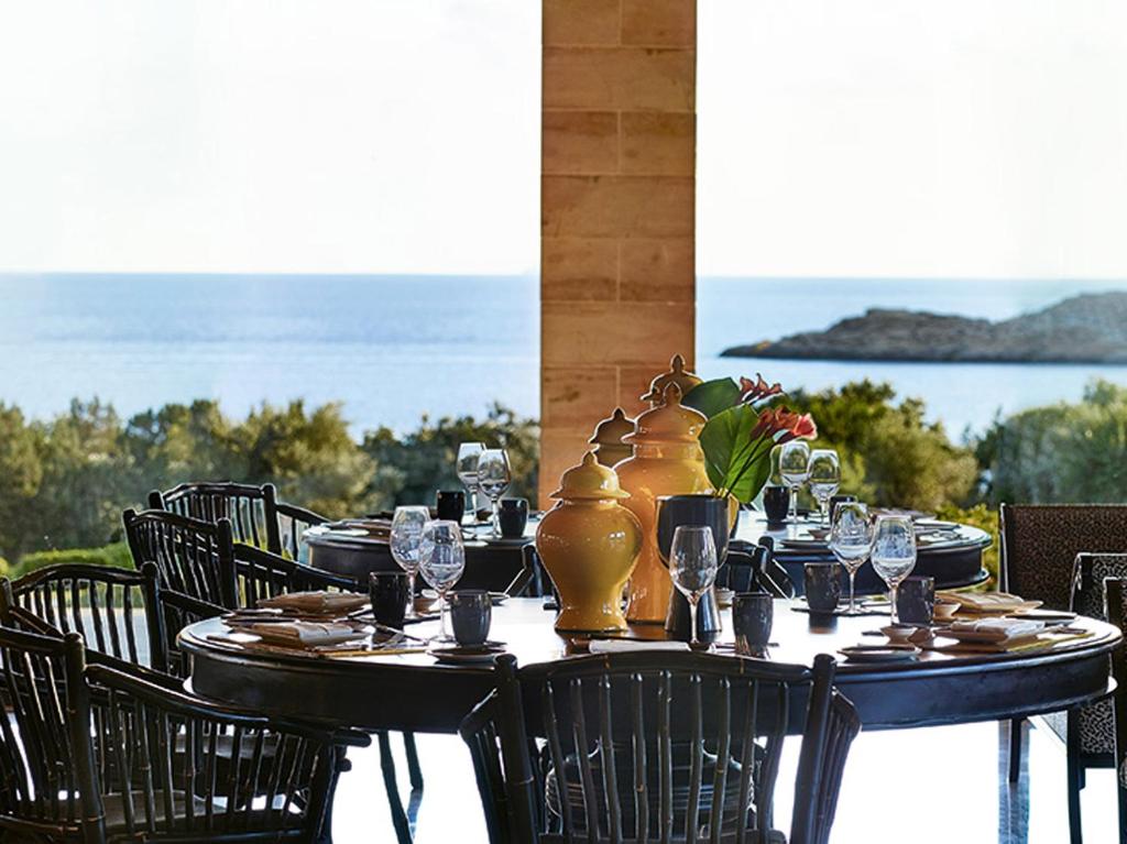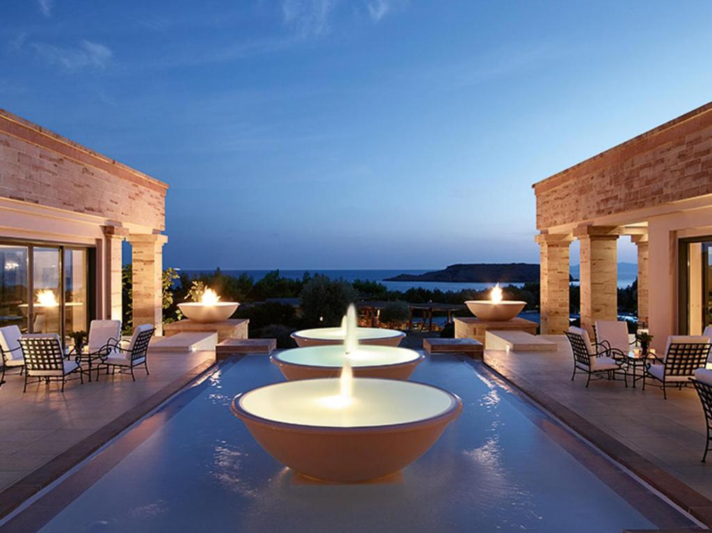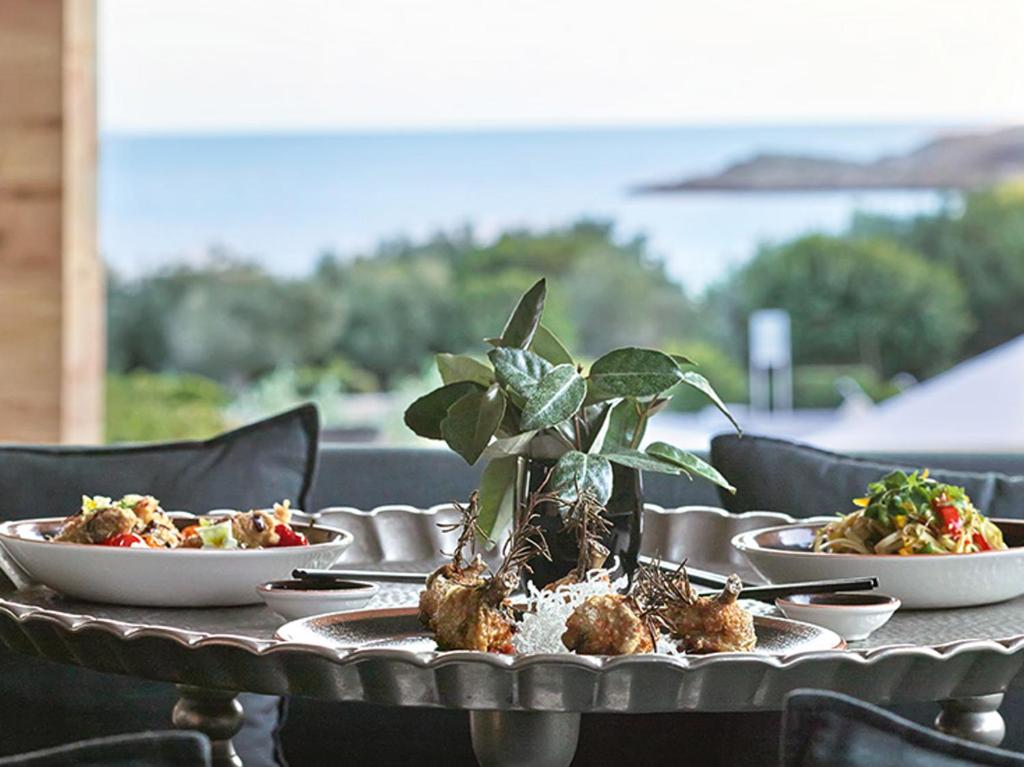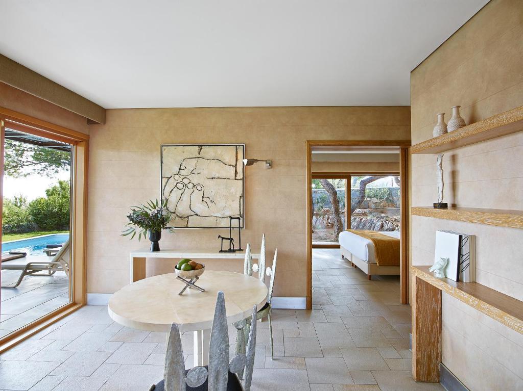 The resort features terracota-colored bungalows and private villas set amid stone-paved paths and olive trees. They offer spacious living and dining areas, while most enjoy spectacular sea and pool views. In-room facilities include a satellite TV, DVD player and bathrobes.